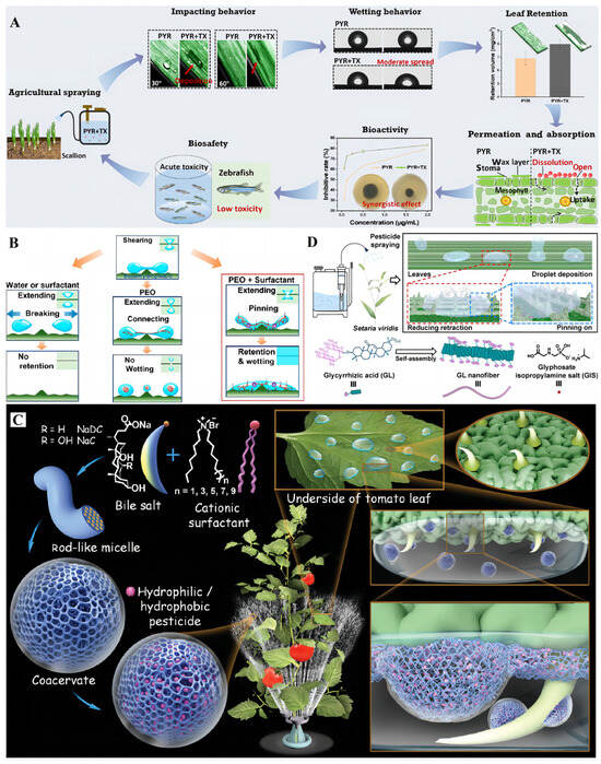 Du et al. [,,,,,,] researched green pesticide additives that enhance the deposition and adhesion of spray droplets on plant surfaces, as shown in Figure 9A. Their findings indicate that optimizing pesticide formulations can significantly increase the pest control effectiveness while reducing environmental contamination. This research is vital in demonstrating how environmentally friendly additives can improve the pesticide application efficiency. However, the long-term effects of these additives on non-target organisms and soil health need further investigation to ensure ecological safety. Song et al. [,] introduced a strategy that combines flexible polymers with surfactants to improve droplet retention and coverage on plants, as shown in Figure 9B. Their approach enhances the impact of pesticides, suggesting a new avenue for optimizing pesticide formulations. This innovation could lead to more efficient pest management practices; however, the durability and potential environmental effects of these polymers and surfactants, especially after degradation, require a thorough assessment to avoid unintended consequences. Wang et al. [] tackled the challenge of pesticide waste on the underside of leaves by developing a bile salt/cationic surfactant with nanoscale hydrophilic/hydrophobic domains, as shown in Figure 9C. This ensures effective pesticide deposition on varying surfaces. This advancement is significant, as it addresses a common inefficiency in pesticide applications. However, the scalability of producing such surfactants and their potential toxicity to beneficial insects and aquatic ecosystems must be carefully evaluated. Jia et al. [] developed a green pseudo-polymeric film surfactant using fatty acids and hexamethylenediamine to control droplet behavior on superhydrophobic surfaces. This innovation aids in optimizing pesticide applications. While this surfactant presents a promising solution to droplet management, the stability of the film and its long-term environmental impact, particularly in terms of biodegradability and interactions with soil microorganisms, must be further explored. Hu et al. [,] created a nano pesticide delivery system that enhances foliar deposition and enables controlled release, providing a sustainable method for pest control, as shown in Figure 9D. This system shows great potential for increasing the pesticide effectiveness while minimizing the environmental impact. However, the development and long-term effects of nanomaterials in agricultural settings need thorough investigation, especially regarding their interaction with soil and water systems.
