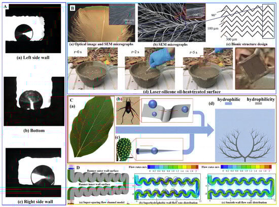 (A) Schematic diagram of microchannel superhydrophobic surface contact angle. (B) Morphology observation of duck feather structure, design of bionic surface, anti-fecal adhesion, and self-cleaning test. (C) Source of inspiration for designing a mist-collecting surface; (a) camphor tree leaf vein; (b) desert beetle and its back catchment map; (c) cactus and its spikes’ catchment map; and (d) fog catchment surface. (D) Modeling the flow channel of a superhydrophobic wall irrigator and its flow rate distribution.
