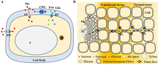 Fruit sugar metabolism disorder associated with fruit translucency. (A): schematic diagram of the metabolism of photosynthates in sinks. The sucrose transported by vascular tissue enters the sink tissue through the symplastic and exoplasmic pathways. Sucrose in the exosomal space can enter the cell via sucrose transporters (ST), or it can be broken down into glucose and fructose by the cell-wall invertase (CWI) and then enter the cell via hexose transporters (HT). Suc: sucrose, Fru: fructose, Glu: glucose. (B): proposed causes of fruit translucency. As fruit ripens, the exoplasmic pathway becomes dominant. Due to unknown factors, the CWI activity of the translucent tissue increased sharply. More sucrose was broken down into glucose and fructose and released into the extracytosomal space, resulting in a higher osmotic potential in the water-centered regions. The accumulation of water in the extracytosomal space and the reduction in cellular void ratio leads to a lower refractive index of light and translucent flesh.