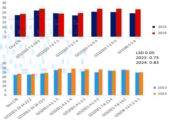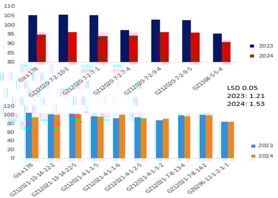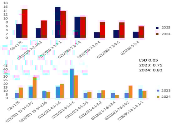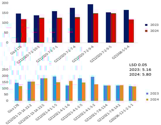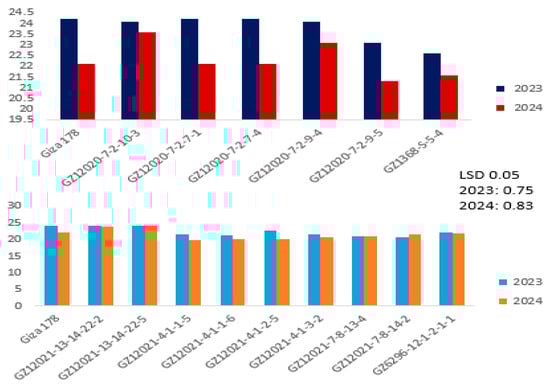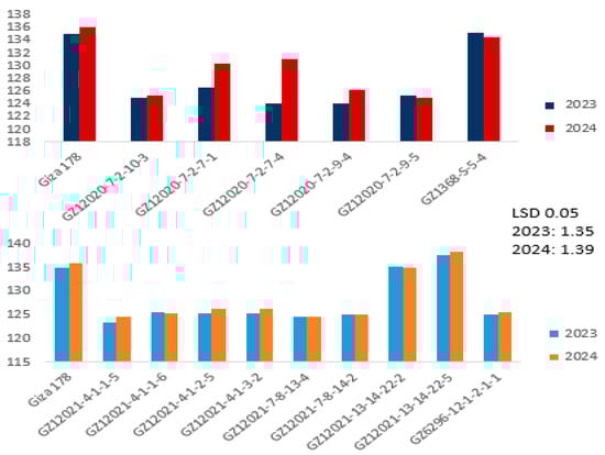 Plant height in season 2023 was generally higher than plant height in season 2024 for all rice genotypes. According to data in Figure 2, the majority of rice genotypes showed plant heights that were desirable in both of the research seasons (2023 and 2024). This suggests that these elite genotypes are short in stature and are well-suited for mechanical harvesting, which can save time, labor, and money, and increase farmer income.