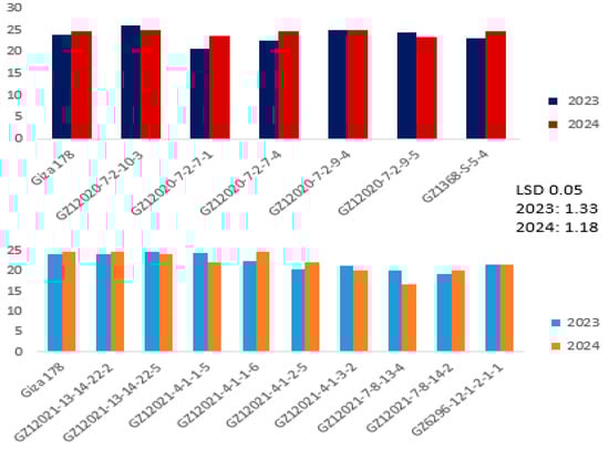 In both seasons of investigation (2023 and 2024), Giza 178 and its fixed progenies GZ12020-7-2-9-4 and GZ12020-7-2-10-3 produced the longest panicles compared to GZ1368-S-5-4 and other genotypes of the same cross, as shown in Figure 4. The hybrid combinations of Giza 178 and GZ6296-12-1-2-1-1, identified as GZ12021-13-14-22-2 and GZ12021-13-14-22-5, gave the highest panicle lengths, with a highly significant difference from the other parent, GZ6296-12-1-2-1-1 (Figure 4).