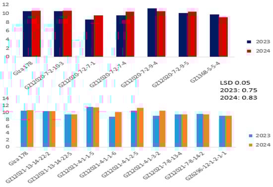 In both seasons of research, the rice genotypes GZ12020-7-2-9-4, GZ12020-7-2-9-5, and GZ12020-7-2-10-3 produced better grain yields than their parent GZ1368-S-5-4, with no significant difference from the other parent, Giza 178 (Figure 8). For the genotypes generated from Giza 178 and GZ6296-12-1-2-1-1, the rice genotypes GZ12021-4-1-1-5, GZ12021-4-1-2-5, and GZ12021-13-14-22-2 exhibited better grain yield than their parents in 2023 and 2024 (Figure 8).