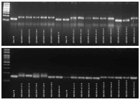 Agarose gels stained with ethidium bromide showing genetic polymorphism among 16 rice (Oryza sativa L.) genotypes using SSR primers (RM302 and RM279).