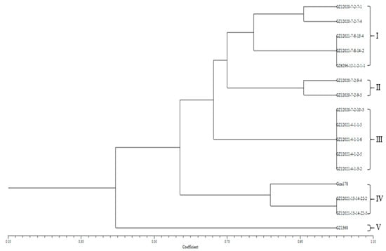 In order to generate similarity values between the genotypes under study, the input matrix for the genetic diversity among the genotypes was generated for SSR markers alleles. Five clusters were formed out of the genotypes (Figure 10). Five genotypes made up Cluster Ⅰ (GZ12020-7-2-7-1, GZ12020-7-2-7-4, GZ12021-7-8-13-4, GZ12021-7-8-14-2, and GZ6296-12-1-2-1-1) and were further split into two sub-clusters (Ⅰa and Ⅰb) that were divided at a similarity value of 0.77. Cluster Ⅱ had two genotypes (12020-7-2-9-4 and GZ12020-7-2-9-5) that had a similarity value of 0.70 compared to other clusters. Alternatively, cluster Ⅲ, which was distinguished from other clusters by a similarity value of 0.66, had five genotypes (GZ12020-7-2-10-3, GZ12021-4-1-1-5, GZ12021-4-1-1-6, GZ12021-4-1-2-5, and GZ12021-4-1-3-2) with an identical similarity value. Cluster Ⅳ contains three genotypes (Giza178, GZ12021-13-14-22-2, and GZ12021-13-14-22-5) and splits into two sub-clusters (Ⅳa and Ⅳb) with a similarity value of 0.82. Cluster Ⅴ has a single genotype (GZ1368) that has a similarity value of 0.39 to the other clusters.