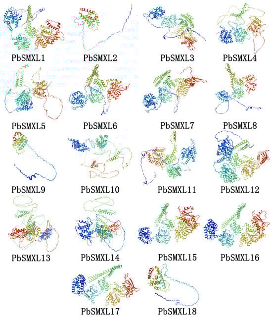 In total, 18 PbSMXLs were identified from the genome of ‘duli’ by the bioinformatics methods. These SMXL genes were named PbSMXL1–PbSMXL18 according to their chromosomal positions. The coding sequence (CDS) length ranged from 675 bp (PbSMXL9) to 3159 bp (PbSMXL13, PbSMXL14); the protein length ranged from 224 (PbSMXL9) to 1052 (PbSMXL13, PbSMXL14) amino acids; the molecular weight ranged from 26.36 kDa (PbSMXL2) to 120.71 kDa (PbSMXL7); and pI ranged from 5.98 (PbSMXL16) to 9.49 (PbSMXL9) (Table 2). The fat coefficients of these proteins were less than 100, and all of them were hydrophobic proteins. All of the proteins were unstable, except for PbSMXL2, PbSMXL6, PbSMXL8, PbSMXL9, PbSMXL15, PbSMXL16, and PbSMXL18. Protein secondary structures were predicted, and the results are shown in Table 2. The alpha helix percentage ranged from 30% (PbSMXL18) to 60% (PbSMXL8), the extended strand percentage ranged from 6.92% (PbSMXL8) to 21.67% (PbSMXL18), and the random coil percentage ranged from 33.08% (PbSMXL8) to 54.56% (PbSMXL10) (Table 2). The beta turn percentage was zero. Subcellular localization prediction of these family members showed that they were all localized to the chloroplasts. Protein tertiary structure prediction showed that the spatial positions of the 18 amino acid residues varied, and this resulted in differences in the three-dimensional spatial structures of proteins (Figure 1). Higher homology of ‘duli’ SMXL protein family members indicates higher similarity in the three-dimensional spatial structure.