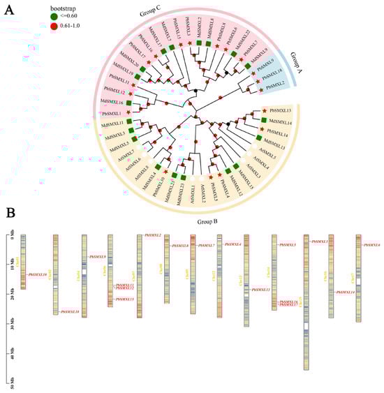 Phylogenetic analysis and chromosome distribution of SMXL genes. (A) Phylogenetic analysis of SMXL proteins in Arabidopsis thaliana (At), Pyrus betulifolia L. (Pb), and Malus × domestica (Md). Different colors represent different groups. Red pentagrams indicate Pyrus betulifolia L., white circles indicate Arabidopsis, and green rectangles indicate Malus domestica. (B) Chromosomal distribution of PbSMXL genes. Blue indicates low gene density, and red indicates higher gene density.