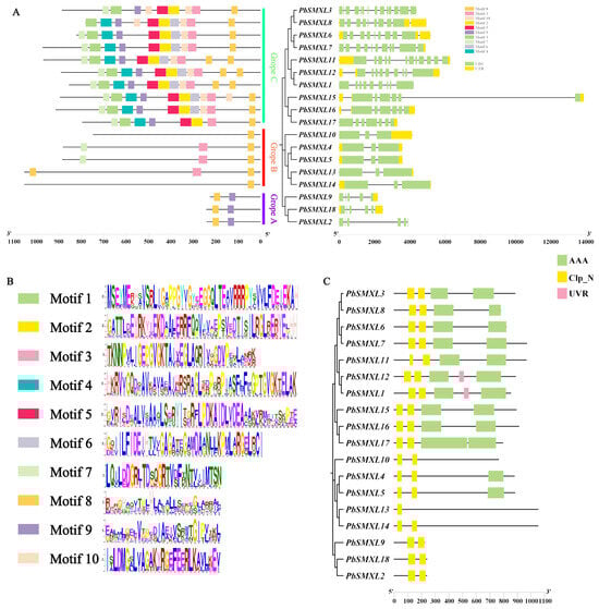 To further clarify the functions of PbSMXL, the structure and conserved motifs of all SMXL proteins were analyzed using the ‘duli’ whole-genome sequence and genome annotation file. All PbSMXL members contained Clp-N domains, and some members contained AAA and UVR (Figure 3C). The intron and exon analysis finds (Figure 3A), in Group C, the PbSMXL members contained 6−13 introns; in Group B, each member contained 2 introns. All members of Group A contained five introns except for PbSMXL9. Furthermore, a total of 10 motifs were identified in 18 PbSMXL genes, and these were named Motif 1 to Motif 10. Each subfamily had a similar motif; in Group C, all members contained Motif 9, Motif 8, Motif 7, Motif 5, Motif 3, Motif 2, and Motif 1. In Group A, all members contained only two Motifs (Motif 8 and Motif 9). Meantime, some Motifs were only present in specific subfamilies, such as Motif 10, Motif 6, and Motif 4, which were only present in Group C. In conclusion, the number, types, and distribution of motifs in the ‘duli’ SMXL family members were relatively conserved.