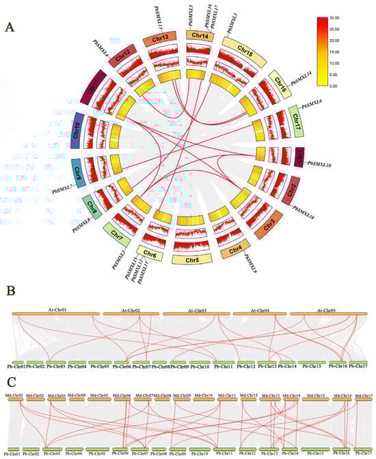 Gene replication and collinearity analysis of ‘duli’ SMXL gene family members. (A) Collinearity analysis of the ‘duli’ SMXL family genes. The red line represents the homologous gene pairs associated with the ‘duli’ SMXL family genes. (B) Collinear analysis of ‘duli’ with Arabidopsis thaliana SMXL genes. (C) Collinear analysis of ‘duli’ with apple SMXL genes. The gray part in the background represents the colinear block of ‘duli’ with Arabidopsis thaliana and apples, respectively, and the red line represents the homologous gene pair between ‘duli’ and the other two genomes.