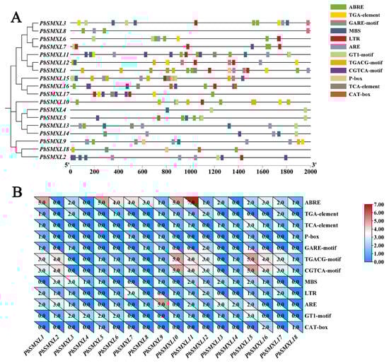 Cis-element analyses of ‘duli’ SMXL genes. (A) Cis-acting element distribution, with different colored wedges representing different cis-elements. (B) Heatmap of the number of cis-acting elements in the promoter region of the PbSMXL genes.