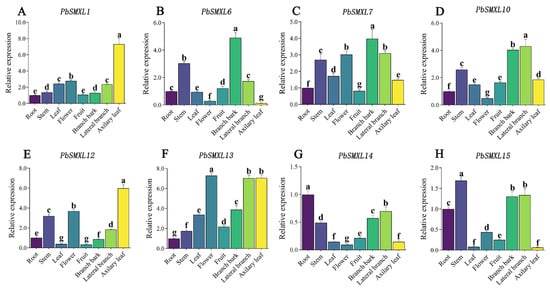 The expression analysis of eight PbSMXL genes in different tissues is shown in Figure 6. PbSMXL6 and PbSMXL7 were most highly expressed in branch bark. PbSMXL10 was most highly expressed in lateral branches. PbSMXL1 and PbSMXL11 were most highly expressed in axillary leaves. PbSMXL13 was weakly expressed in all tissues. The expression patterns of PbSMXL family members varied among tissues.