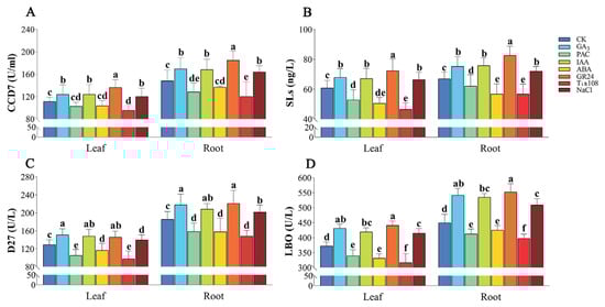 The enzyme activity and SL content changes in ‘duli’ treated with different plant growth regulators and NaCl for 72 h. (A) The activity of CCD7. (B) The content of SL. (C) The activity of D27. (D) The activity of LBO. Different colors indicate different stress treatments. Statistical analysis was performed using IBM SPSS, with pairwise comparison using the LSD method. Different lowercase letters indicate significant differences, and the same lowercase letters represent no significant differences at p < 0.05.