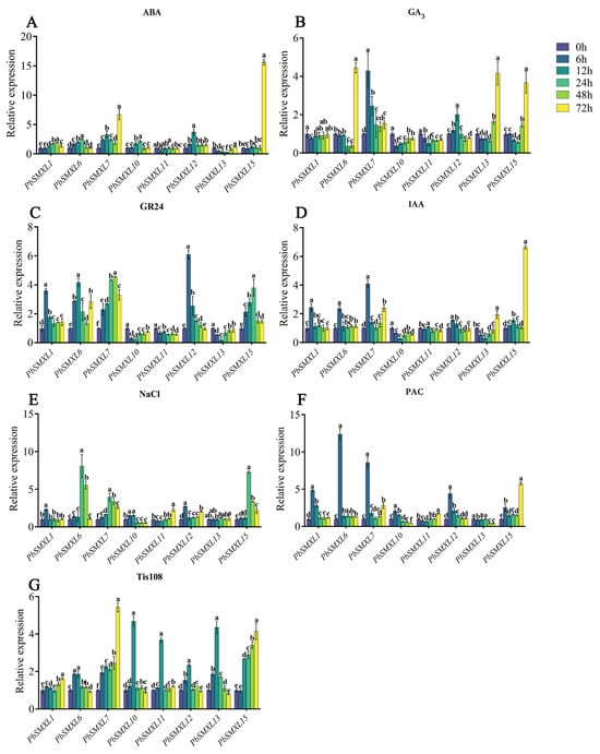 Expression analysis of PbSMXLs under exogenous growth regulator and salt stress. (A) ABA treatment. (B) GA3 treatment. (C) GR24 treatment. (D) IAA treatment. (E) NaCl treatment. (F) PAC treatment. (G) Tis108 treatment. Different colors indicate different time periods. Statistical analysis was performed using IBM SPSS, with pairwise comparison using the LSD method. Different lowercase letters indicate significant differences, and the same lowercase letters represent no significant differences at p < 0.05.