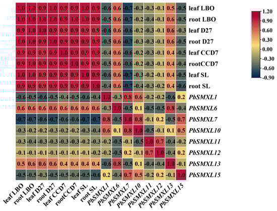 We performed correlation analyses between enzyme activity, SL, and the expression of PbSMXLs (Figure 9). We found that the expression of PbSMXL6 was positively correlated with the content of SL and enzyme activities LBO, CCD7, and D27 in roots and leaves. The expression of PbSMXL13 was positively correlated with activities of LBO and D27 in roots and leaves. The expression of PbSMXL7 was negatively correlated with the content of SL and enzyme activities LBO, CCD7, and D27 in roots and leaves. The expression of PbSMXL15 was negatively correlated with the content of SL and enzyme activities of LBO and CCD7 in leaves. The expression of PbSMXL15 was negatively correlated with the content of SL and enzyme activities of LBO and D27 in roots. In addition, we also found that the content of SL was positively correlated with the enzyme activity of LBO, D27, and CCD7 in leaves and roots.
