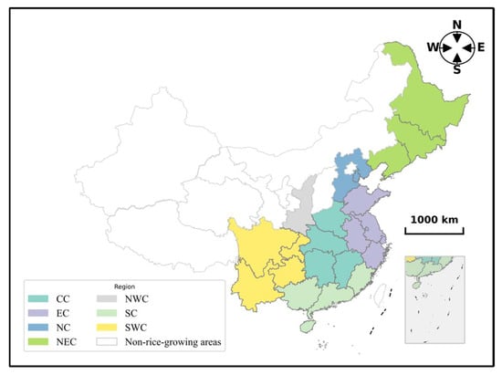 This study analyzed information from 11,811 rice cultivar trials involving 10,987 different varieties (Table S1), conducted across 23 rice-growing provinces in China between 1990 and 2023. The data were primarily sourced from the China Rice Data Center (http://www.ricedata.cn, accessed on 25 May 2024) and the Seed Industry Management Bureau, Ministry of Agriculture and Rural Affairs of China (http://www.zzj.moa.gov.cn, accessed on 8 July 2024). The dataset included rice yield (GY) and six key agronomic traits: growth duration (GD), plant height (PH), grains per panicle (GPP), thousand-grain weight (TGW), effective panicle number (EP), and seed setting rate (SSR). Missing values were noted for EP and SSR in Heilongjiang and for GD in Guangdong. The rice production system in China was divided into six agro-ecological sub-regions based on the unique climate, topography, and management practices: Northeast (NEC), North China (NC), East China (EC), Central China (CC), South China (SC), Southwest (SWC), and Northwest (NWC) (Figure 1).