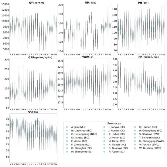 Violin plots illustrating the distribution of key rice traits across rice-growing provinces. Traits include grain yield (GY), growth duration (GD), plant height (PH), grains per panicle (GPP), thousand-grain weight (TGW), effective panicle number (EP), and seed setting rate (SSR). Letters A–W represent different provinces as shown in the legend.