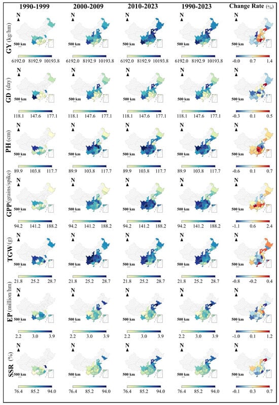 Spatial distribution of major rice traits (GY, GD, PH, GPP, TGW, EP, and SSR) across rice-growing provinces during different time periods (1990–1999, 2000–2009, 2010–2023) and their change rates from 1990 to 2023. The color scale indicates the magnitude of each trait and its rate of change.