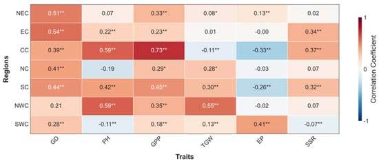 Correlation heatmap of rice traits with GY across regions. Traits: GD, PH, GPP, TGW, EP, and SSR. Regions: NEC, EC, CC, NC, SC, NWC, SWC. The color scale shows correlation coefficients, with red for positive and blue for negative correlations. Significance levels are denoted by ‘*’ (p < 0.05) and ‘**’ (p < 0.01).