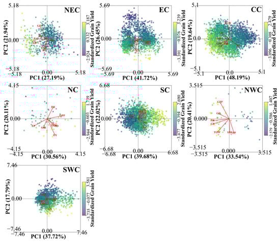 PCA biplots of rice traits and yield across regions (NEC, EC, CC, NC, SC, NWC, SWC). The axes represent the first two principal components (PC1 and PC2), and the arrows indicate the contribution of each trait (GD, PH, GPP, TGW, EP, SSR). Points are colored by standardized GY.