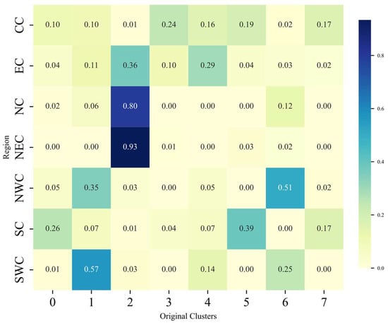 Proportion of clusters in each agro-ecological sub-region after clustering rice varieties. Rows represent regions (NEC, EC, CC, NC, SC, NWC, SWC), and columns represent original clusters (0–7). The color scale indicates the proportion of varieties in each cluster within a region.