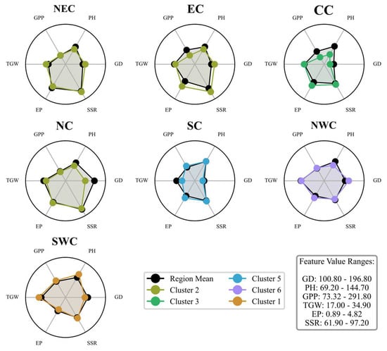 Radar charts comparing regional mean trait values and the dominant cluster in each region (NEC, EC, CC, NC, SC, NWC, SWC). Traits: GD, PH, GPP, TGW, EP, and SSR. Black lines show regional means, colored lines show the dominant cluster. Feature value ranges are provided in the legend.
