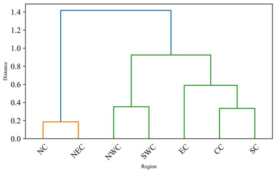 Hierarchical clustering of regions (NEC, NC, EC, CC, SC, NWC, SWC) based on the proportion of cultivar clusters. The y-axis represents the distance between regions, indicating the similarity in cluster composition.