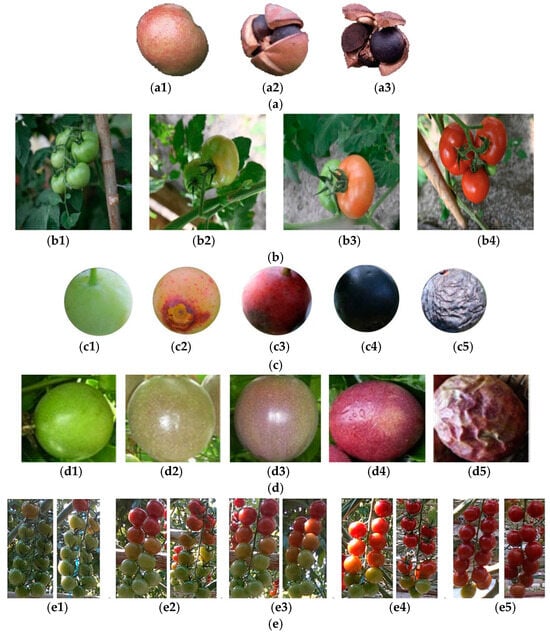 Examples of fruits of different maturities. (a) Camellia oleifera fruit in unripe ((a1) shell without cracks), ripe ((a2) shell with slight cracks), and overripe stages ((a3) rough skin, shell cracks, and seed exposed). (b) Tomato in mature green (b1), breakers (b2), pick (b3), and red (b4) stages. (c) Blueberry in unripe ((c1) green), beginning to ripen ((c2) slightly red), semi-ripe ((c3) red), fully ripe ((c4) purplish black), and overripe stages ((c5) purplish black with texture). (d) Passionfruit in young ((d1) green), near-young ((d2) 20–50% red), near-mature ((d3) 50–80% red), mature ((d4) 90–100% red), and after-mature stages ((d5) fully red with texture). (e) Cherry tomato in 20% red (e1), 40% red (e2), 60% red (e3), 80% red (e4), and 100% red (e5) stages. (f) Mango in dark olive green (f1), olive (f2), apple green (f3), brown (f4), saddle brown (f5), and dark golden (f6) stages.