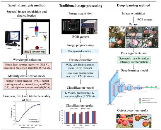 The accuracy, speed, and robustness of object detection and recognition are directly related to the harvesting efficiency, quality, and speed. RGB, spectral, and depth cameras are widely used in harvesting robots to obtain color, texture, and other maturity-related information about fruit in the structured/non-structured environment. The workflow of different methods for fruit maturity detection and recognition is summarized in Figure 2. Many researchers have conducted extensive and in-depth research on fruit maturity detection and classification techniques, which can be subdivided into the following aspects [6,7]: