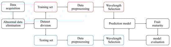 The maturity of fruits can be characterized by changes in the soluble solids content, titratable acidity, moisture contents, and pH value. The NIR spectrum can be classified into the long NIR spectrum and the short NIR spectrum. The short NIR has a deeper penetration capability beneath the skin that allows it to detect glucose molecules more accurately, compared with the long NIR. NIR spectroscopy has been widely used to measure fruit maturity parameters. Figure 3 shows that this technology is implemented by fruit sampling, NIR spectra acquisition, outliers’ elimination, data preprocessing, dataset division, wavelength range selection, and maturity prediction modeling. In addition, chemometric analysis, as a significant aspect of NIR technology, can accurately determine maturity parameters for model calibration. Portable NIR devices have been applied to the fruit maturity detection field in the literature. In [18], due to the thickness of durian fruit, the authors comprehensively utilized short NIR spectra (450–1000 nm) and long NIR spectra (860–1750 nm) to predict four growth stages of durian fruit. The experiment results showed that a combination of rind spectra and stem spectra effectively increased the classification accuracy. Huang et al. [19] used a NIR full-transmittance spectra for cherry maturity evaluation. A prediction model of soluble solids content and a maturity classification model were established by partial least squares regression (PLSR) and extreme learning machine (ELM), respectively. The best results of the total, immature, intermediate, and mature stages of the prediction set achieved 91.31%, 95.38%, 89.23%, and 91.35%. The ELM model presented higher scalability and lower computational complexity by obtaining the minimum training errors. Following this, Semyalo et al. [20] collected pineapple spectral data in the spectral range of 200–1100 nm with an online spectrometer. In addition to the SSC value, the authors evaluated the internal color of the fruit to achieve a correlation coefficient of double cross-validation (Rv) of 0.97 and a root mean square error of double cross-validation (RMSEV) of 0.034. Moreover, the idea behind these methods is to predict maturity index values using regression techniques and then apply a hard threshold to the predicted values to estimate the maturity state of fruits. To classify the fruit maturity directly, Ali Shah et al. [21] proposed a novel approach to directly classify on-tree mango fruit maturity based on the reference maturity index, in which a handheld NIR maturity meter was developed to acquire spectral data, preprocess data, reduce data dimensionality, and predict the fruit maturity.