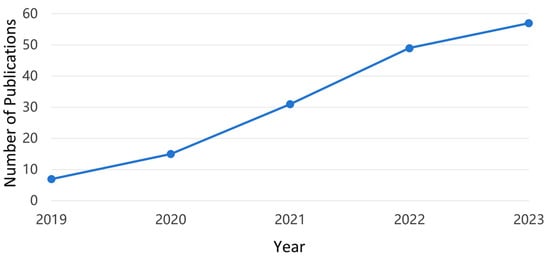 Deep learning has witnessed a breakthrough in computer vision and fruit detection fields. Muthulakshmi and Renjith reviewed the use of deep learning networks for fruit maturity detection [38]. Until September 2024 a total of 195 articles were found in the Web of Science database (https://webofscience.clarivate.cn (accessed on 19 November 2024)) using the keywords: ‘deep’ + ‘learning’ + ‘fruit’ + ‘maturity detection’. Figure 4 shows that the application of deep learning for fruit maturity detection is a popular research area with increasing growth in scientific production.