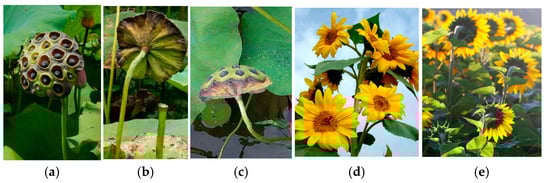 Lotus seedpods and sunflowers at different viewing angles: (a) front side, (b) back side, (c) top view, (d) front side, and (e) back side.