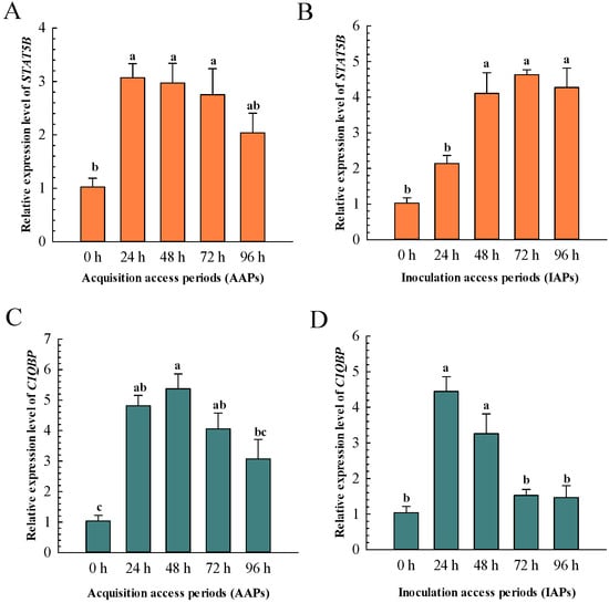 Relative expression levels of STAT5B (A,B) and C1QBP (C,D) in S. avenae after different acquisition access periods (AAPs) and inoculation access periods (IAPs), as determined using qPCR. The values presented are the means ± SEs. Different lowercase letters above the bars within each panel indicate significant differences (Tukey’s test: p < 0.05).