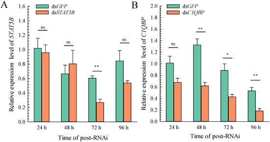 The total RNA was extracted from the aforementioned samples and converted into cDNA through reverse transcription. The expression levels of STAT5B and C1QBP mRNA following dsRNA injection were assessed using qPCR. The efficiency of RNA interference was determined using the following formula [30]: RNAi efficiency = [(relative expression of the target gene in the dsGFP control group − relative expression of the target gene in the specific dsRNA treatment group)/relative expression of the target gene in the dsGFP control group] × 100%.