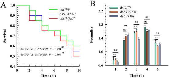 Within 24 h of molting, the adult aphids were injected with dsSTAT5B, dsC1QBP, and dsGFP using the method described in Section 2.6. After the injection, the aphids were transferred to healthy wheat seedlings and placed in the artificial climate incubator described in Section 2.1. Their survival status was observed and recorded daily over a 10-day period, and their fecundity was observed and recorded daily over a 5-day period. A total of 4 biological replicates were used, and each sample contained 20 aphids.