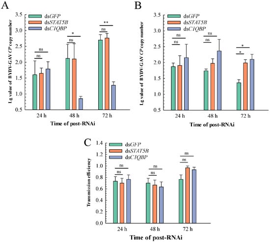 The effects of STAT5B and C1QBP silencing on the acquisition, retention, and transmission of BYDV-GAV: (A) The acquisition of BYDV-GAV (CP copy number) in S. avenae after target gene silencing during three acquisition access periods (AAPs) was determined using qPCR. (B) The retention of BYDV-GAV (CP copy number) in S. avenae after target gene silencing during three inoculation access periods (IAPs) was determined using qPCR. (C) The transmission efficiency of target-gene-silencing aphids during three IAPs was determined using RT-PCR to detect the BYDV-GAV infected status of the plant. The values presented are the means ± SEs. Significant differences among the means were tested using the t-test (ns p > 0.05; * p < 0.05; ** p < 0.01).