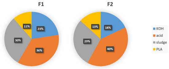 Figure 2 shows the composition of the fertilisers produced. In the case of both fertilisers, the mass of deinking paper sludge was about 30% of the total mass of the fertiliser. The addition of PLA, which constituted 11–13% of the total mass of the fertiliser, made the content of alternative raw materials in the fertilisers 41–42%, depending on the fertiliser.