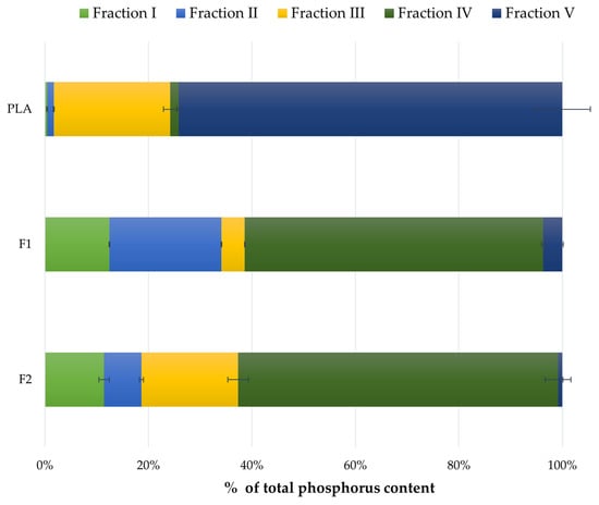 In the case of poultry litter ash, the phosphorus content of fraction V was found to be 74%. This represents permanently immobilised phosphorus, which is unavailable to plants. It is phosphorus in the form of amorphous calcium phosphate and aluminosilicates associated with potassium, calcium, manganese and iron [47,48]. The ash was found to contain only 0.4% readily available phosphorus, with phosphorus bound to aluminium, iron or calcium representing 26% of the total phosphorus content. The results of the analysis demonstrate that chemical reactions occurring during the production of fertilisers result in a change in the forms of occurrence of the phosphorus present in the ash. The proportion of readily available phosphorus in fertilisers F1 and F2 was found to be 12% and 11% of the total phosphorus content, respectively. The proportion of phosphorus bound to aluminium, iron, and calcium is approximately 85% of the total phosphorus content. It is hypothesised that this form of phosphorus may become available to plants over time, contingent on soil conditions such as moisture content, pH or temperature [41]. The phosphorus fraction designated as V, or residual fraction, constituted 4% of the total phosphorus content in fertiliser F1 and 1% in fertiliser F2.