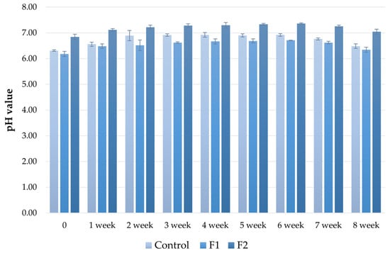 The fertilisers obtained provide not only valuable organic matter but also the main nutrients (P and K) and microelements required by plants, thereby increasing their market value. The results of the incubation study showed that fertiliser application resulted in an increase in soil pH. The highest increase in pH of the fertilised soil was observed in week six. It was 8.6% for the soil treated with F1 fertiliser and 7.4% for the soil treated with two fertilisers. This can be attributed to the fact that the fertilisers were rich in calcium and Ca2+ ions could replace the H+ ions on the clay–humic complex and consequently decrease the soil acidity [58]. Another reason for the increase in pH, which also occurred in the control soil samples, could be the decarboxylation of organic anions during the decomposition of organic matter [59]. However, during the sixth and seventh weeks, the soil pH slightly decreases, which may be related to the buffering properties of the soil.