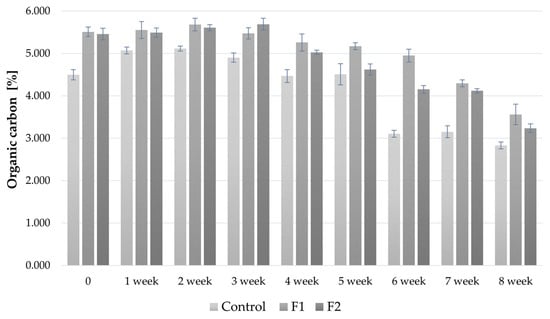 The addition of fertilisers has been demonstrated to result in a notable increase in the organic carbon content of soil, with a mean increase of approximately 20%. The organic carbon content remained at a comparable level for the samples treated with fertilisers throughout the initial three-week period of the experiment, exhibiting a slight increase in the case of the control sample. A decline in organic matter content was observed from week three onwards, which can be attributed to the mineralisation processes occurring in the soil, leading to the decomposition of organic matter. Soil microorganisms play a pivotal role in these processes. They are involved in the decomposition of a wide range of organic compounds, including cellulose, starch, and fats [52]. Their activity is closely correlated with the soil pH. The greatest microbial activity in soil is observed at a pH of 6 to 7. From week four to week eight, a distinct decline in organic carbon content is evident across all soil samples. In the case of the control sample, there was a 37% reduction in organic carbon content. In comparison, the fertilised soil samples exhibited a decrease of 32% and 36% for fertilisers F1 and F2, respectively.