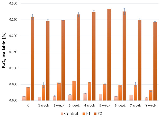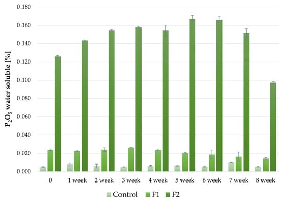 Water-soluble phosphorus is characterised by immediate availability to plants. Figure 6 illustrates the alterations in water-soluble phosphorus concentration within the soil over the eight-week incubation period. The graph illustrates that the addition of fertilisers to the soil significantly affects the content of water-soluble phosphorus. The addition of fertilisers to soil results in a markedly elevated phosphorus content in comparison to the control samples. Furthermore, soil fertilised with F2 fertiliser contains 5–8 times more water-soluble phosphorus, which is a consequence of the higher phosphorus content in the fertiliser. It was observed that for soil fertilised with F1 fertiliser, the phosphorus content exhibited a slight increase up to week three, after which it remained at a similar level. From week seven, however, a decrease in the content of water-soluble phosphorus was noted. In the case of soil fertilised with F2, the content of this parameter remains constant up to week six, after which a slight decrease is observed. A comparable trend is evident in the phosphorus content of unfertilised soil.