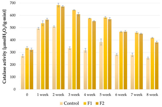 Microorganisms are considered the mainly source of enzymes of soils, and enzyme activities are strongly associated with the soil microbiological properties [63]. Catalase is an enzyme that is commonly found in animal cells, fungi, aerobic bacteria, and photosynthetic plants. The function of catalase is to protect organisms from the deleterious effects of oxidative stress [64]. Soil organic matter is the primary source of enzyme substrate [65]. Therefore, the introduction of organo-mineral fertilisers into the soil contributed to a significant increase in catalase activity (92% and 82% for F1 and F2 fertiliser compared with control, respectively), which was most visible in the third week of incubation.