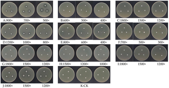 A: Prothioconazole; B: Zhongsheng Tetramycin Solution; C: Tetramycin Oxine–copper; D: Streptomycin Sesquisulfate; E: Tetramycin; F: Thiodiazole–copper; G: Copper Hydroxide; H: Zhongshengmycin; I: Kasugamycin; J: Zhongshengmycin; K: negative control. The dilution multiples of each chemical agent is located below respective pictures.