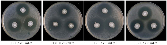 The bacterial inhibition ability of Bacillus velezensis ZY1 suspension was determined using the same method. Bacillus velezensis ZY1 was cultured in LB medium for 24 h, and bacterial suspensions were prepared at concentrations of 1 × 106, 1 × 107, 1 × 108, and 1 × 109 cfu·mL−1. The experiment was repeated three times.