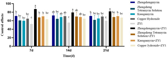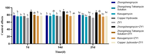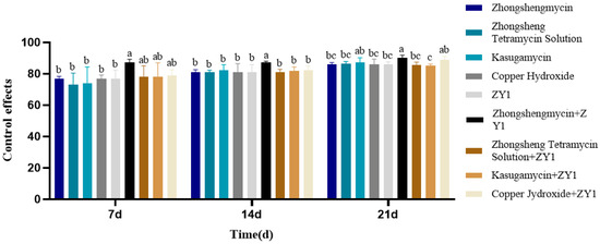 In this study, we evaluated the control effects of four chemical agents and the biocontrol agent ZY1 in a greenhouse setting, as well as the combination of both tools. The compounding ratios for the four combinations were as follows: VZhongshengmycin:ZY1 = 5:5; VZhongsheng Tetramycin Solution:ZY1 = 6:4; VKasugamycin + VZY1 = 5:5; VCopper Hydroxide + VZY1 = 5:5.