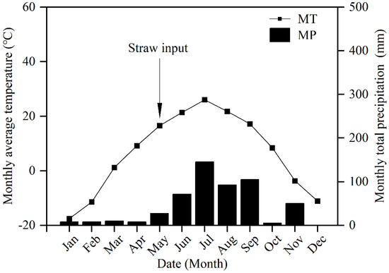 Monthly average temperature (°C) and monthly total precipitation (mm) at the test site. Note: MP: monthly total precipitation; MT: monthly average temperature.