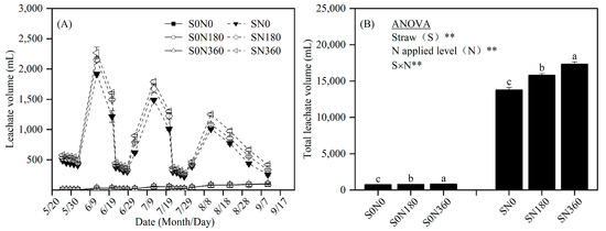 Effect of straw return with nitrogen fertilizer application on the soil leachate volume. Note: The S0 treatment denotes the absence of straw return, while the S treatment indicates the presence of straw return. The designations N0, N180, and N360 correspond to nitrogen fertilizer application rates of 0, 180, and 360 kg hm−2, respectively. Different letters signify statistically significant differences among the nitrogen fertilizer application rates (p < 0.05). The annotations ** represent significant at p < 0.01 levels, respectively. Panel (A) depicts the volume dynamics of the leachate in 2021, while panel (B) presents the total volume of the leachate in 2021.
