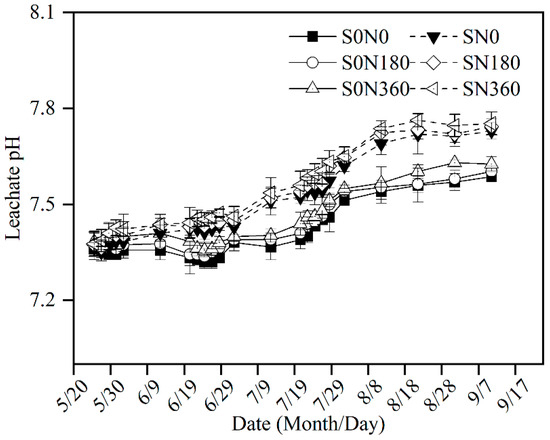 The effect of the straw return and nitrogen (N) application levels on the leachate pH is illustrated in Figure 4. It was observed that returning straw to the field resulted in a significant increase (p < 0.05) in the leachate pH. During the leaching test, the leachate pH exhibited substantial changes over time, gradually increasing as the process progressed. Notably, the rate of pH increase was more pronounced in the treatments that included straw return, suggesting a faster salt elution rate in these treatments. The treatments S0N0, S0N180, S0N360, SN0, SN180, and SN360 increased the leachate pH by 22.67%, 23.33%, 24.33%, 36.67%, 37.00%, and 37.67%, respectively, throughout the leaching process. This indicates that water leaching has the potential to lower soil pH. At the same nitrogen application level, the overall performance was significantly higher in the straw return treatment than in the no-straw return treatment. Under the N0, N180, and N360 nitrogen application levels, the leachate pH increased by 1.89%, 1.84%, and 1.66%, respectively, in comparison with the no-straw return scenario. This indicates that returning straw to the field can significantly elevate the pH of soil leachate. Furthermore, the leachate pH increased with higher nitrogen application levels, regardless of whether the straw was returned; however, no significant differences were observed among the nitrogen application levels.