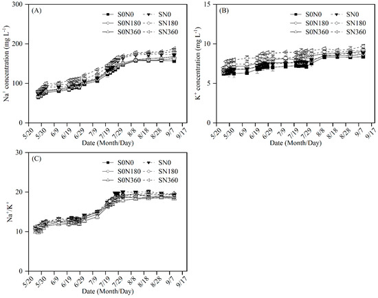 Effect of straw return with nitrogen fertilizer application on the Na+ and K+ concentrations and Na+/K+ ratio in the soil leachate. Note: panel (A) depicts the Na+ concentration in the leachate, panel (B) depicts the K+ concentration in the leachate, and panel (C) depicts the Na+/K+ ratio in the leachate.