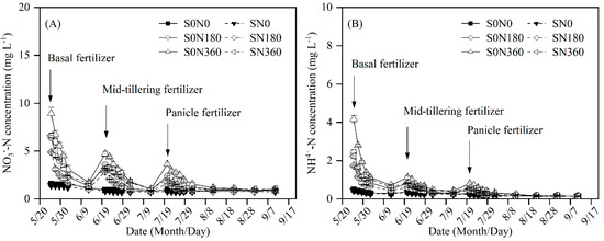 Effect of straw return with nitrogen fertilizer application on the NO3−-N and NH4+-N concentrations in the soil leachate. Note: panel (A) depicts the NO3−-N concentration dynamics in the leachate, while panel (B) depicts the NH4+-N concentration dynamics in the leachate.