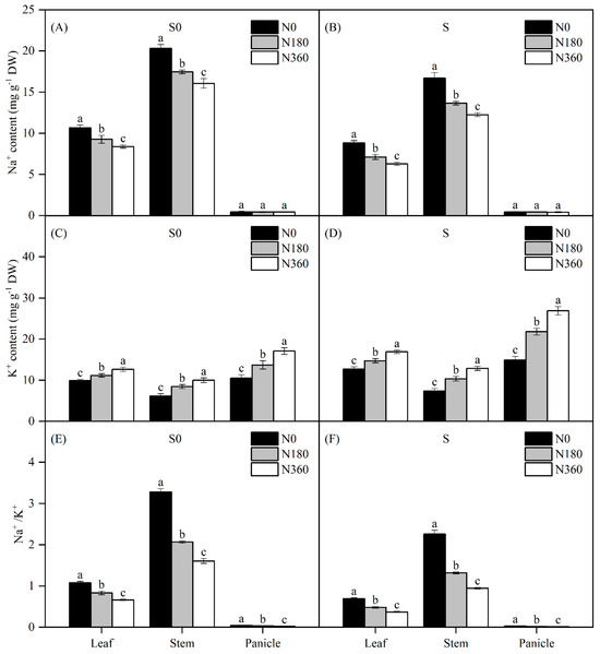 At the rice maturity stage, Na+ was primarily concentrated in the leaves and stems. Under the straw return conditions, the Na+ contents in the leaves, stems, and panicles in the N0 treatment accounted for 33.99%, 64.33%, and 1.68% of the overall plant, respectively, with N180 and N360 exhibiting similar effects. Conversely, K+ was predominantly concentrated in the panicles, following the order of panicle > leaf > stem. This finding indicates that rice mitigates the injury caused by salinity stress by regulating the accumulation of Na+ and K+ in different organs.