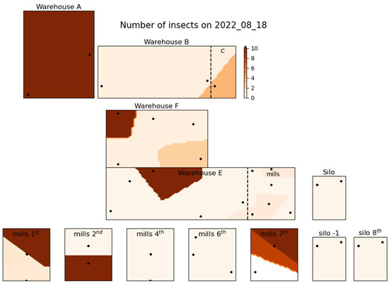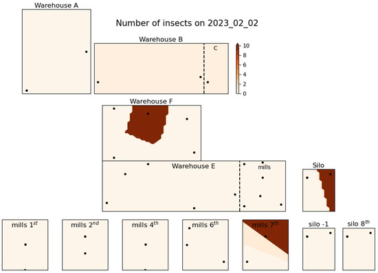 - Trematerra, P.; Sciarretta, A. Spatial distribution of some beetles infesting a feed mill with spatio-temporal dynamics of Oryzaephilus surinamensis, Tribolium castaneum and Tribolium confusum. J. Stored Prod. Res. 2004, 40, 363–377. [Google Scholar] [CrossRef]